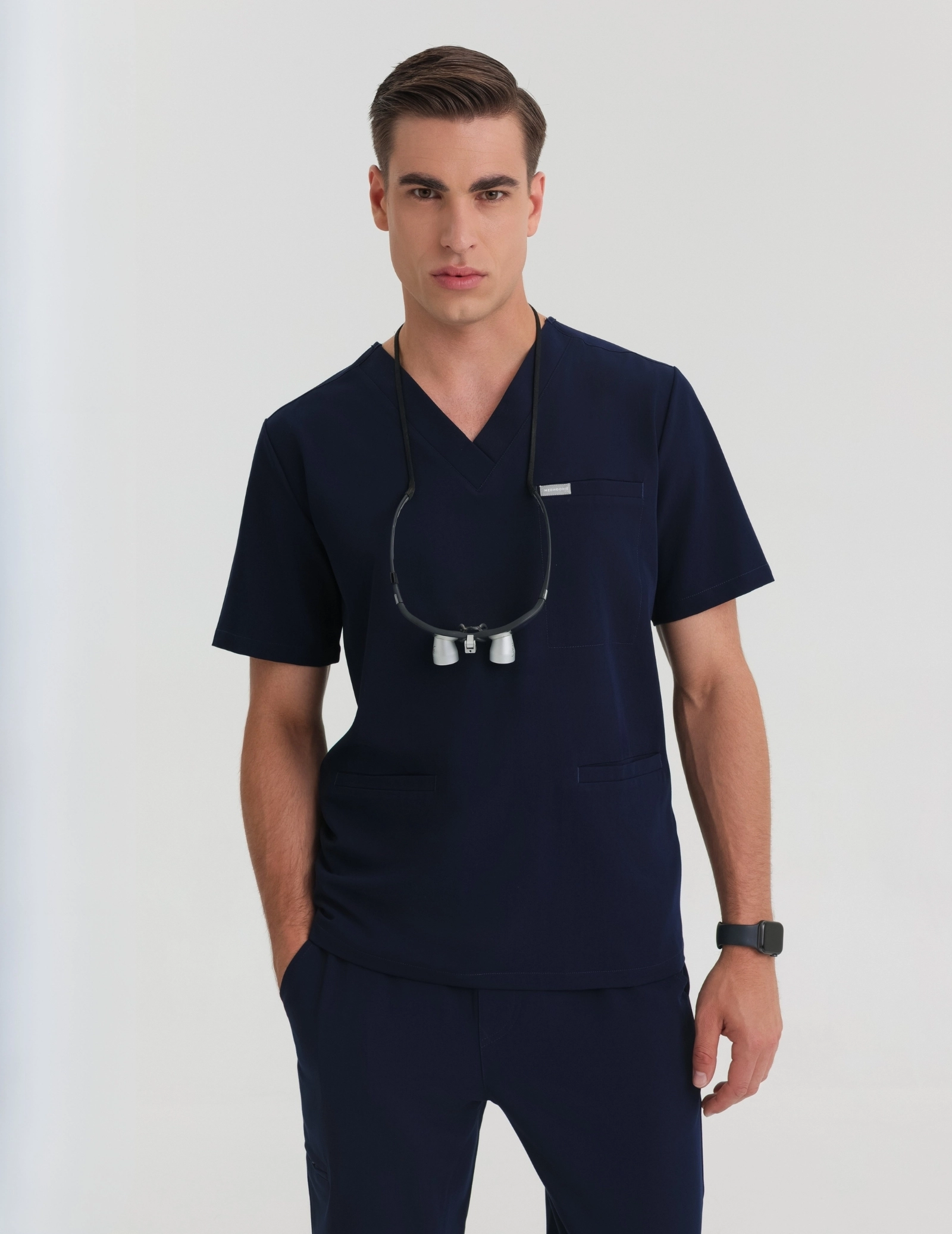 La Casacca Medica Uomo Birbal valorizza le spalle e la silhouette maschile. È dotata di un moderno scollo e di tre tasche capienti. Tasche innovative e alta qualità delle finiture e delle cuciture.