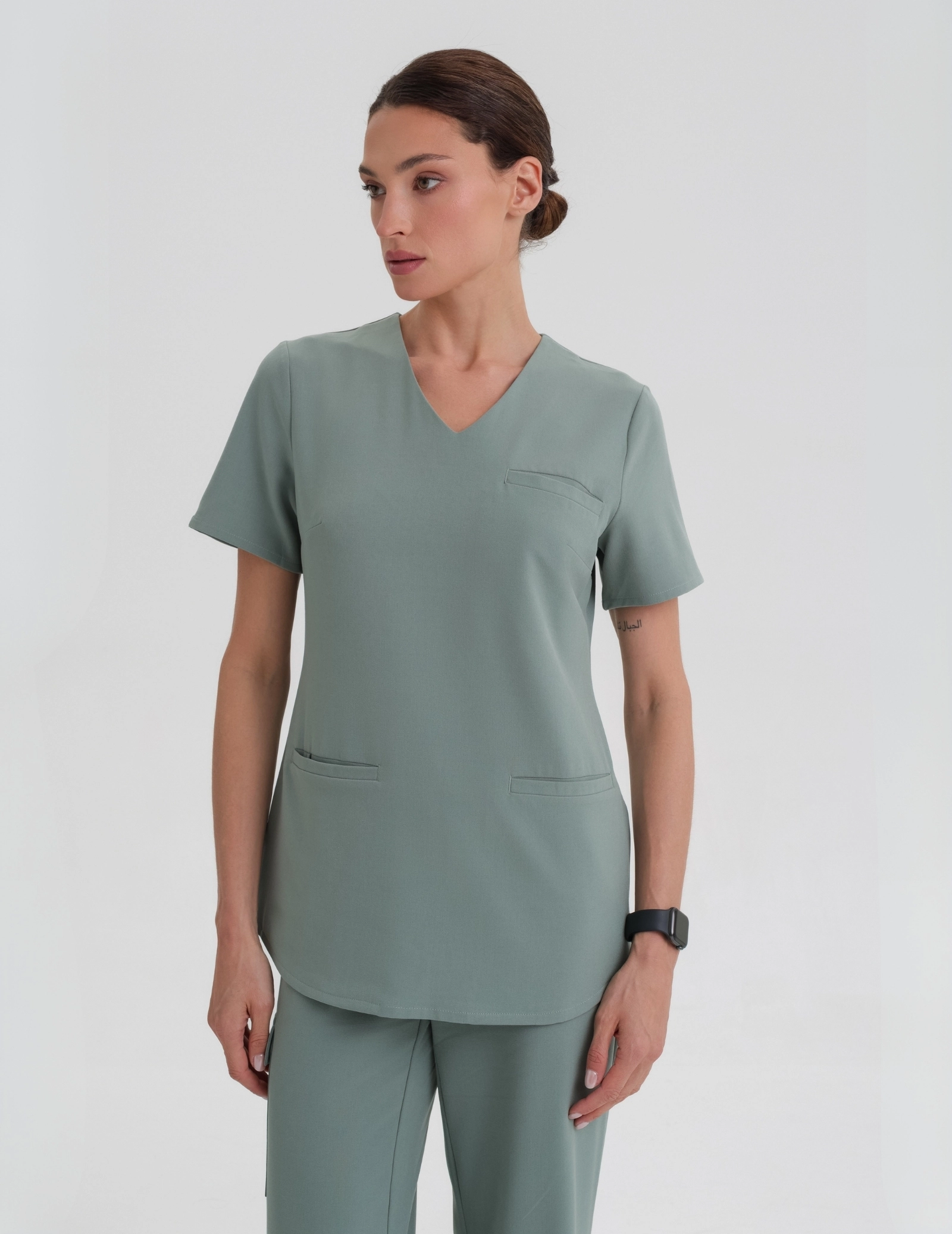 Casacca medica con elegante scollo senza cuciture, delicatamente rifinito, e tre tasche. Più lunga sul davanti e sul retro, più corta ai lati.