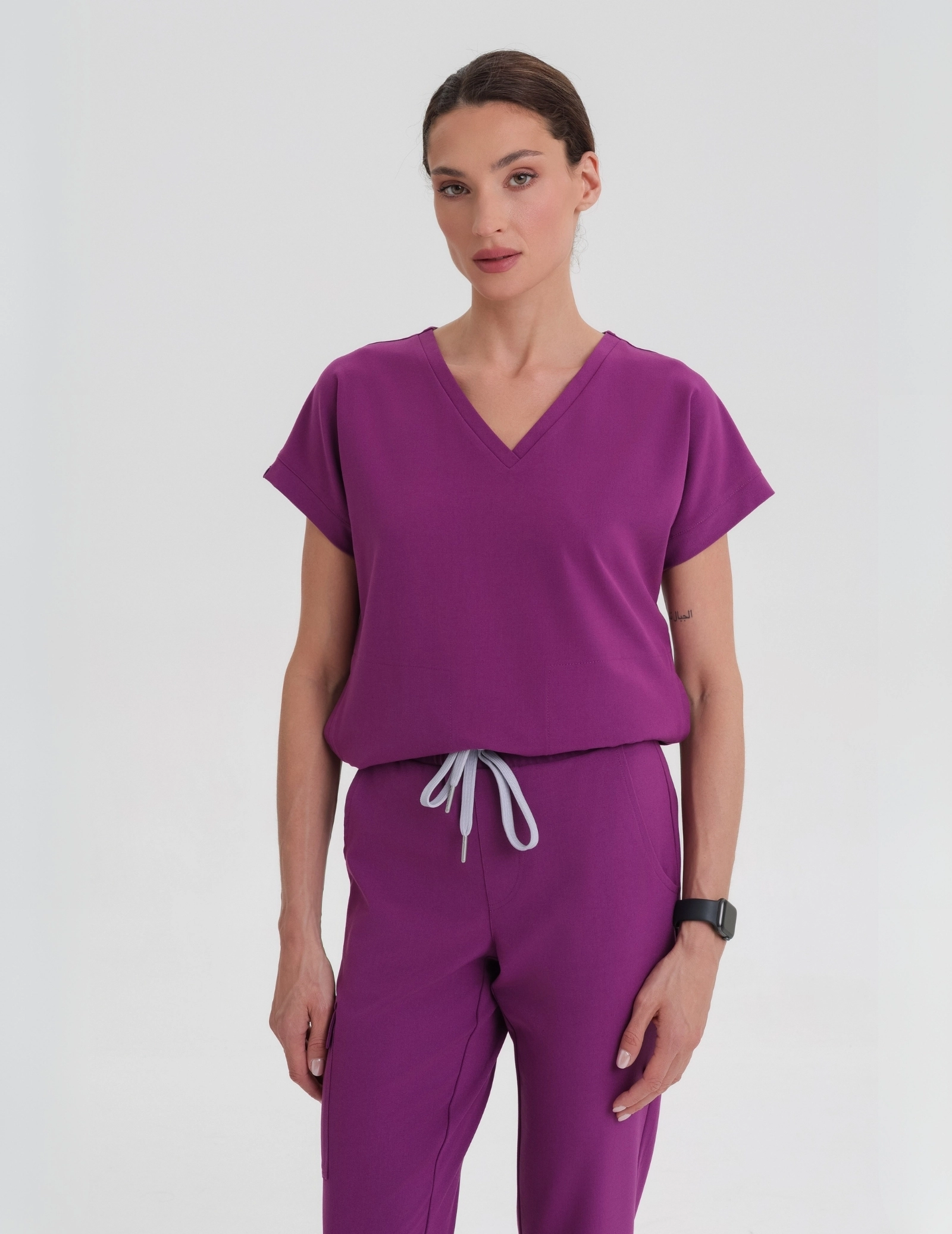 Bluza medyczna z taliowanym krojem, pięknie podkreśla dekolt , szyję i ramiona. Boczne rozcięcia zwiększające komfort.