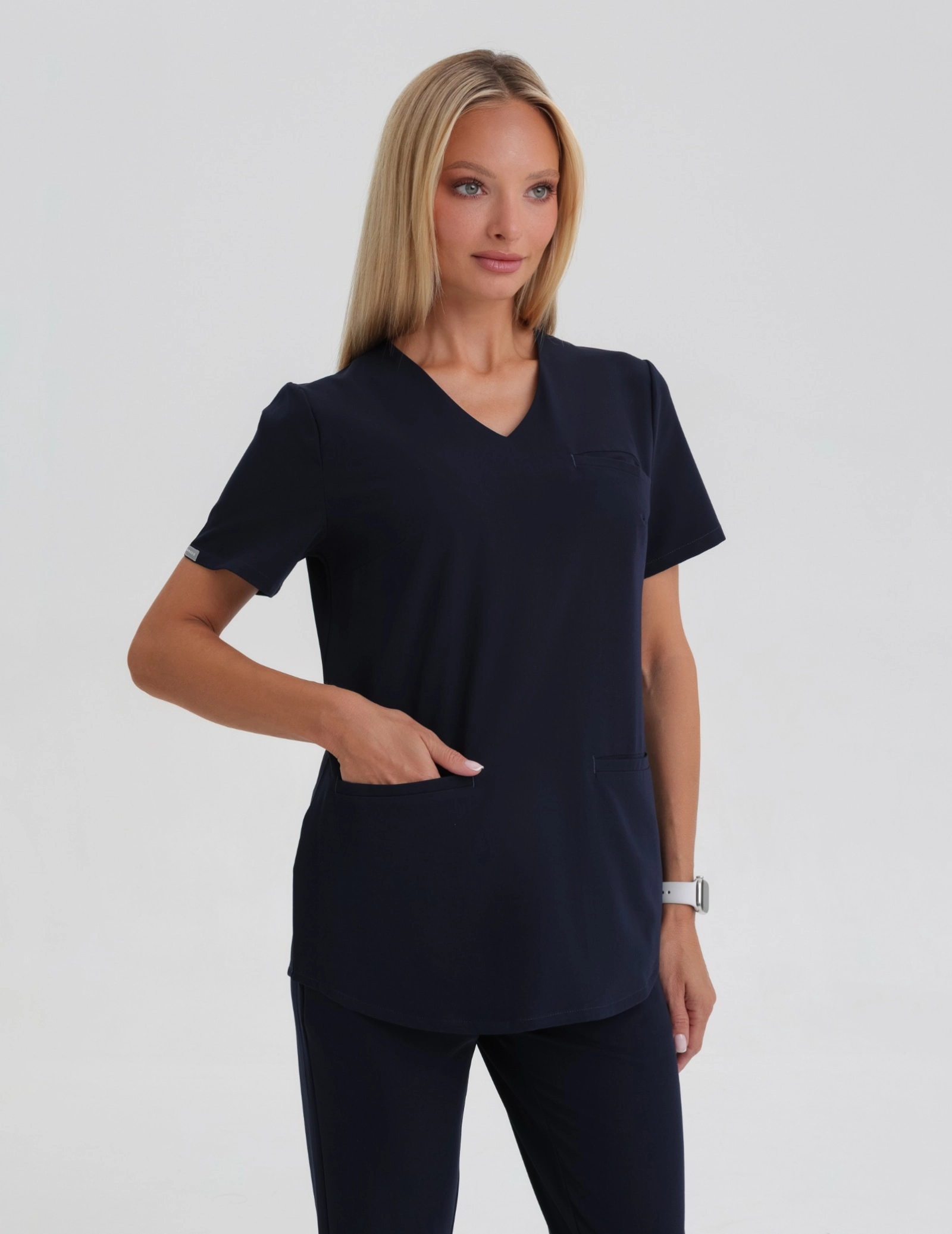 Casacca medica con elegante scollo senza cuciture, delicatamente rifinito, e tre tasche. Più lunga sul davanti e sul retro, più corta ai lati.