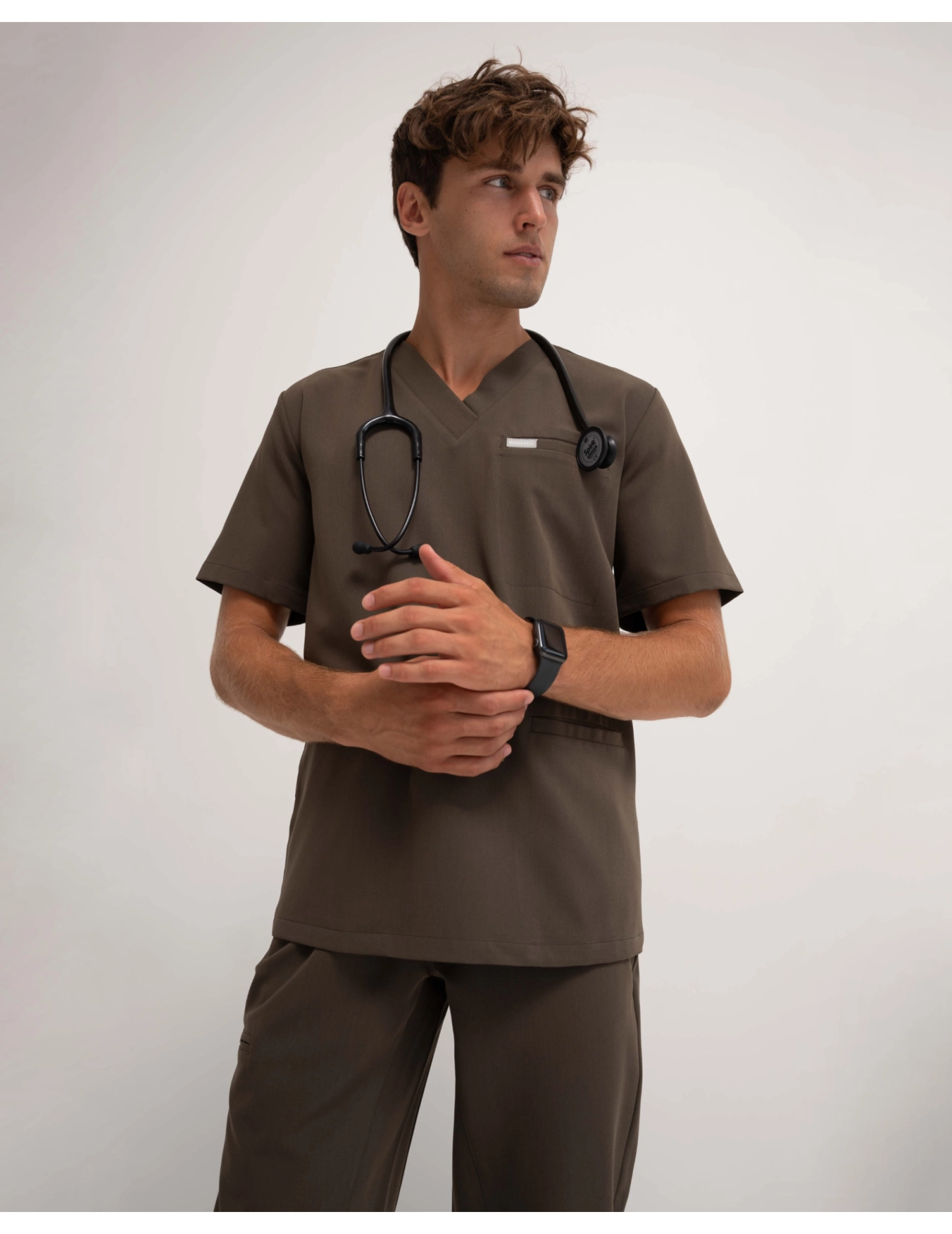 La Casacca Medica Uomo Birbal - OLIVE NIGHT di Medhoodie è una combinazione eccellente di comfort e funzionalità. Realizzata in un tessuto di alta qualità, garantisce comodità e libertà di movimento per tutta la giornata. Le maniche corte e lo scollo a V conferiscono un aspetto moderno e ordinato, mentre il taglio aderente assicura comfort durante il lavoro quotidiano.